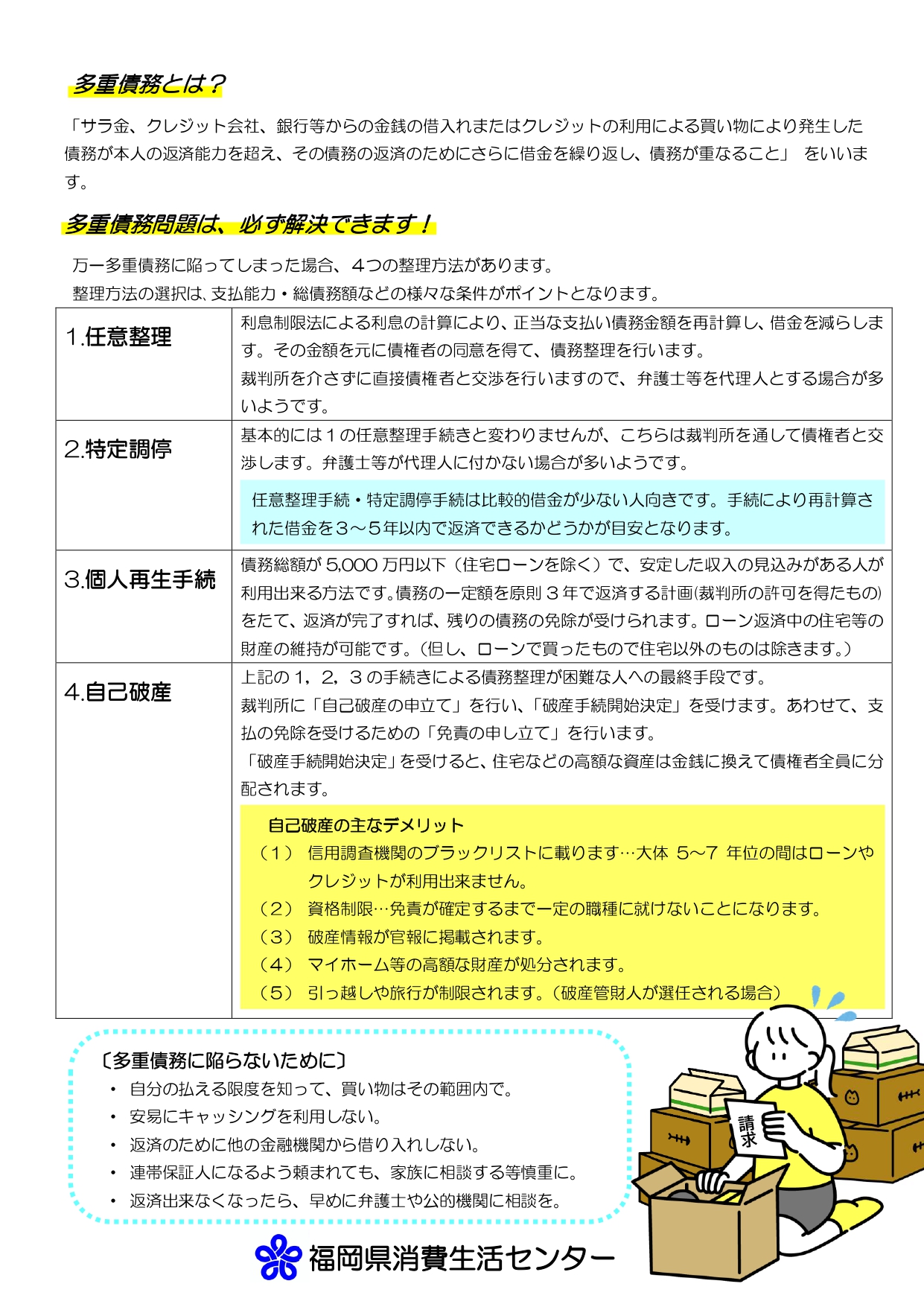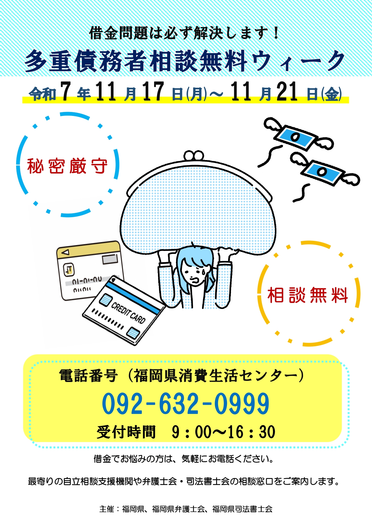 多重債務者が抱える問題の解決、救済を図るため、福岡県・福岡県弁護士会・福岡県司法書士会が連携して「多重債務者無料相談ウィーク」を実施します。